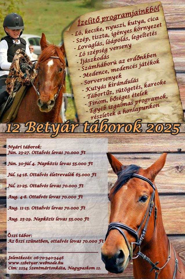 Ha szereted az állatokat és szeretnéd kipróbálni milyen is lehet egy igazi lovon ülni, vagy már gyakorlott lovas vagy és szeretnél egy hetet kedvenc állataid között eltölteni és fejlődni, akkor itt az alkalom. Remek lehetőség új lovas barátok szerzésére! A nyári szünetben minden táboros héten, hétfőtől péntekig, a 12 Betyár Lovasiskolában.